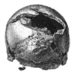 A skull, found during Dymond's second exploration, which is gouged with many cuts from an edged weapon. (Drawn in 1886 for Dymond's book, Worlebury: An Ancient Stronghold in the County of Somerset.)