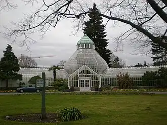 The W. W. Seymour Botanical Conservatory is a Victorian-style conservatory located in Wright Park. Built in 1907, it was named in honor of donor William W. Seymour. Designed by Isaac J. Knapp,[3] its wings and twelve-sided central dome contain some 3,500 panes of glass. Six sculptures created by former conservator Clarence Deming rest among the plants and reflect African, Māori, and Aztec traditions.