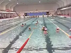 Institute's indoor swimming pool, constructed in 1984[15] and put into service since 1986, is a combination of public and competition pool. The pool is maintained in constant temperature. It was then the largest swimming pool in China equipped with solar heating system, which were able to heat 70 tons of hot water daily according to its original design.[15][16] Affiliated to and overseen by teaching and researching section of swimming in the institution, the Swimming pool have been run by a private contractor.,[17] especially in summer. Athletes here have competed in different level of swimming event as well as less publicized fin swimming competition, having attained phenomenal accomplishments such as 10 world champions. There were 6 world records, 4 Asian records and 5 national records kept here.[18]