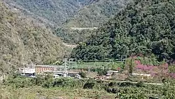 The Wanda Power Station (萬大發電廠; Wàndà Fādiànchǎng) is located about 2 kilometres (1.2 mi) downstream and was the only part of the project to be completed before the construction halted due to World War II. In 1943, it began generating power using water from Wanda Creek, which joins with the Wushe Creek here to form the Zhuoshui River. The three Pelton turbines installed at the time are known as unit G3 and have a capacity of 15,000 kilowatts (KW).[7]