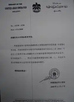 Notification of recognition with Xinjiang Medical University by the UAE Embassy in Beijing