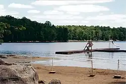 The swimming area has a slide, a basketball net, a water trampoline and an inflatable iceberg. Campers are tested for their swimming ability when they arrive at the camp. Testing is done at a dock that has the shape of an H. The top of the H and the bottom of the H can both be used to swim lengths. At 12.5 metres, the length of the H-dock is around half of the length of a standard pool.[13]
