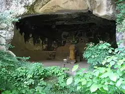 Yagura (やぐら・窟・岩倉・矢倉・矢蔵・谷倉・屋倉, etc.) are artificial caves used during the Middle Ages in Kamakura, Kanagawa Prefecture, Japan, as tombs and cenotaphs.[1][2] It is likely that they were used only as tombs in the beginning, and were later used as cenotaphs.[2] The dead are mostly from the samurai class, but the names of priests and artisans have also been found.[3] These tombs are extremely numerous in the hills surrounding Kamakura, and estimates of their number range from 1,500 to over 5,000. The total number will remain unknown, as many have been destroyed and others may not yet have been found.[4]
