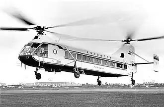 The only produced variant was the Yak-24 – Army transport helicopter, that could carry up to 19 airborne troops, 12 stretchers or 2,000 kg (4,409 lb) of cargo, including field guns or GAZ-69 army car.[6] In the nose was a 12.7 mm A-12,7 machine gun mounting, manned by radio operator.[4] Yak-24 was also used as a flying crane, lifting an external load of 4,000 kg (8,818 lb).[7] In 1957, the improved model Yak-24U was developed, rebuilt from serial helicopter, with all-metal rotors of larger diameter (21 m/69 ft) and an all-metal wider fuselage.[8] It could carry 40 soldiers or 3,500 kg (7,716 lb) of cargo, including ASU-57 tank destroyer. It completed test program in 1958, but did not enter production.[8] A civilian variant for Aeroflot for 30 passengers was the Yak-24A of 1960, but it was not produced either.[9] There were two proposed models: the Yak-24K nine-seat VIP salon with a shorter fuselage and the civilian Yak-24P for 39 passengers with more powerful 2,013 kW (2,700 hp) turboshaft engines, but neither reached production. The helicopter was little known, so specifications and technical details varied among different sources, and also older publications claimed, that Yak-24U and passenger Yak-24A were produced.