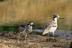 Yala is one of the 70 Important Bird Areas (IBAs) in Sri Lanka.[10] Of 215 bird species of the park, seven are endemic to Sri Lanka.[2] They are Sri Lanka grey hornbill, Sri Lanka junglefowl, Sri Lanka wood pigeon, crimson-fronted barbet, black-capped bulbul, blue-tailed bee-eater and brown-capped babbler. The number of waterbirds inhabiting wetlands of Yala is 90 and half of them are migrants.[3] Waterfowl (lesser whistling duck, garganey), cormorants (little cormorant, Indian cormorant), large waterbirds (grey heron, black-headed ibis, Eurasian spoonbill, Asian openbill, painted stork), medium-sized waders Tringa spp., and small waders Charadrius spp. are among the most common waterbirds. Black-necked stork and lesser adjutant are many of the rare birds that can be seen in the park. The migrant great white pelican and resident spot-billed pelican are also have been recorded. Other waterbirds attracted to the Yala lagoons include lesser flamingo, pelicans, and rare species such as purple heron, night herons, egrets, purple swamphen, and Oriental darter. Thousands of waterfowls migrate to the lagoons of Yala during the northeast monsoon. They are northern pintail, white-winged tern, Eurasian curlew, Eurasian whimbrel, godwits, and ruddy turnstone. The visiting species mingled with residing lesser whistling duck, yellow-wattled lapwing, red-wattled lapwing, and great stone-curlew. Rock pigeon, barred buttonquail, Indian peafowl, black stork, black-winged stilt, and greater flamingo are among the other bird species. Crested serpent eagle and white-bellied sea eagle are the raptors of the park. The forest birds are orange-breasted green pigeon, hornbills, Old World flycatchers, Indian paradise flycatcher, Asian barbets, and orioles.[9]