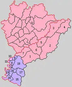 - the village of Nanasato (Shichigo): the former villages of Takaoka, Myōgō, Nagoe (Nagoshi), Notose, Ishiro, Mutsuhira (Mutsudaira) and Hosokawa