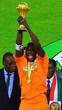 Touré represented the Ivory Coast at six Africa Cup of Nations tournaments, in 2006, 2008, 2010, 2012, 2013 and 2015; his side ended as runners-up in the 2006 and 2012 editions, and won the tournament in 2015. Touré was named in the CAF's team of the tournament in 2008, 2012 and 2015.[80] On 4 February 2015, Touré scored the opening goal in the Ivory Coast's 3–1 semi-final victory over DR Congo to qualify the team for their third Africa Cup of Nations final in nine years.[81] On 8 February, in the final held at the Estadio de Bata in Equatorial Guinea, Touré captained the Ivory Coast as they won a first AFCON title since 1992, defeating Ghana in a penalty shoot-out.[82]