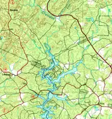 Yellow Creek rises in southern Lumpkin County, less than 2 miles east-northeast of the intersection of U.S. Route 19/State Route 60/State Route 115, and southeast of Dahlonega.[2] The creek heads south for less than a mile, and crosses into Hall County to form Pony's Lake, then crosses back into Lumpkin County, picks up an unnamed branch that originates and runs parallel to Yellow Creek to this point, and heads back into Hall County approximately one mile further on. Yellow Creek crosses State Route 60 as it turns to the southwest, picks up another unnamed branch from the south of State Route 60, and then forms the Yellow Creek arm of Lake Lanier as it meets Little Yellow Creek west of Murrayville. This arm also receives one additional unnamed branch coming from the north, before Yellow Creek meets the Chestatee River, which is submerged under Lake Lanier at their point of confluence at the intersection of the two Lake Lanier arms.[3]