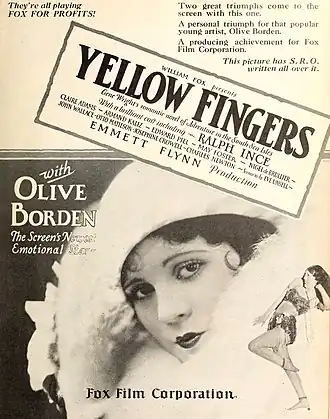Yellow Fingers is a 1926 American silent drama film directed by Emmett J. Flynn and written by Eve Unsell. The film stars Olive Borden, Ralph Ince, Claire Adams, Edward Peil, Sr., Otto Matieson, and Nigel De Brulier. The film was released on March 21, 1926, by Fox Film Corporation.[1][2][3][4]