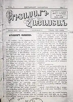It was founded by Stepan Sapah-Gulian in 1903. The first issue was published in only 250 examples. "Yeritasard Hayastan" was edited by G. Yeghikyan, B. Varaztahd, H. Tyurabyan, Arsen Jerejian and others. It published news from Armenia and Armenian diaspora and analytical articles on social and political issues, including the Armenian Question, which was one of the main topics of publications. Yeritasard Hayastan was a weekly until 1973, then became a monthly publication edited by Arsen Jerejian (until 1997).[1]