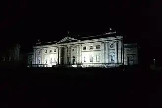 The new building was commissioned to serve as the assizes courts for the City of York. It was designed by John Carr in the neoclassical style, built in ashlar stone and was completed in 1777.[1][4][5] The design involved a symmetrical main frontage of thirteen bays, with single-storey end bays which were slightly recessed: it faced onto the castle courtyard, which was grassed over at that time to form a circle, which became known as the "Eye of the Ridings".[6] The central section featured a tetrastyle portico in antis formed by full-height Ionic order columns supporting an entablature and a modillioned pediment. The wings of four bays each were fenestrated by round headed sash windows on the ground floor and by small square windows on the first floor. The outer bays of the wings also featured full-height Ionic order columns in antis supporting an entablature. Internally, the building was laid out to accommodate two large courtrooms, one to the left and one to the right.[1]