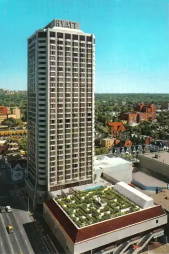 Yorkville Plaza is a 31-storey condominium tower and former hotel in Toronto. The hotel was developed by Ian Richard Wookey, who purchased the Yorkville property in 1966 and hired architects Webb Zerafa Menkès to design the building, which was named the Continental Plaza provisionally. Shortly before construction began in the fall of 1969, Wookey sold the project to a partnership of Hyatt and Great West International Equities, the latter of which was taken over in 1971 by Trizec. In the spring of 1972, the hotel opened as the Hyatt Regency.