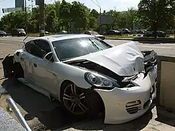 A crashed first-generation Porsche Panamera
