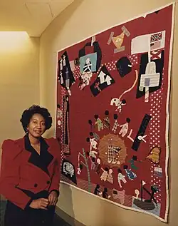 Yvonne Wells with her quilt Yesterday: Civil Rights in the South III (1989) at the first Realizing the Dream concert in Tuscaloosa, AL on January 13, 1990.