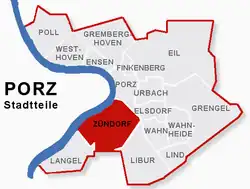 Zündorf (German pronunciation: [ˈtsyːndɔʁf]) is a suburb of Cologne, Germany and part of the district of Porz. Zündorf lies on the right bank of the river Rhine, between Langel and Porz. Zündorf has 12.229 inhabitants (as of 31 December 2008) and covers an area of 8,12 km2.