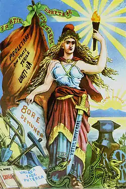 After the Trial of the Fourteen, the Revolutionary Community and all other Bakuninist groups were losing the battle in front of renewed Tsarist repression.[47] Arbore, who now criticized Bakunian anarchism, quickly came to the conclusion that a socialist party was needed as a more radical alternative to the Romanian two-party system: in 1879, he helped organize the first-ever conference of Romanian socialist clubs, and, over the following months, was member of the editorial staff at România Viitoare, the socialist review (as a result of his participation, the magazine also enlisted contributions from Reclus and his brother Élie, as well as from poet Louis-Xavier de Ricard).[48] The next year, he and the Nădejdes were briefly in contact with the senior political radical Titus Dunka, distributing for a while Dunka's gazette Înainte! ("Forward!").[49]