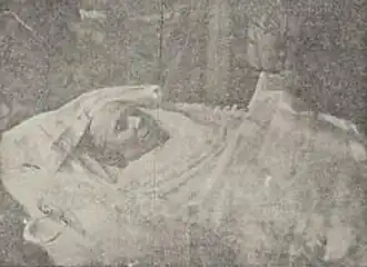 At the end of 1914, rheumatism, diagnosed by doctors in Zinaida, caused complications to her heart.[74] The Parish register, issued by the Saratov Spiritual Consistory to the Voskresenskoye Cemetery Church in the city of Saratov for recording births, marriages, and deaths for the year 1915", lists the cause of her death as myocarditis.[1] Possibly, a cold she caught while feeding birds in the frost played a role. The illness took an "acute and painful" form. During her illness, Nekrasova often recalled her husband and recited his poems by heart. Zinaida Nikolaevna bequeathed to be buried according to the rites of the Orthodox Church and died at her home at Malaya Tsaritsynskaya, house 70 (the State Catalogue of the Ministry of Culture of the Russian Federation lists a different house number — 60),[75] in Ozolina's apartment, at 4:30 a.m. on January 25, 1915.[72] At the funeral (January 27),[1] only a few friends, neighbors, and employees of Saratov newspapers were present. The funeral service took place at the Voskresenskaya Cemetery Church. Priest Sergiy Troitsky, in accordance with the deceased's wishes, repeatedly proclaimed "for the repose of the newly departed Fyokla," but, according to those present, added barely audibly: "also known as Zinaida".[72] In a special supplement to the newspaper Saratovsky Vestnik dedicated to Zinaida Nikolaevna on the occasion of her death, a photograph of her in her coffin was published.[76] Nekrasova was buried at the Voskresenskoye Cemetery in Saratov.[77]