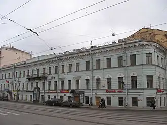 Before his death, the poet decided to enter into a legal marriage with Zinaida (initially discussing this matter with his valet Nikanor Butylin).[45] It is known that Zinaida tried to refuse the wedding. Olga Loman suggested that the poet's persistence was driven by the fear of leaving her without any legal rights. Nekrasov was too weak to be married in a church, and priests one after another refused to perform the wedding at home, "and didn't want to risk their position or invite trouble".[46] According to archival documents found by Olga Loman, permission for a home marriage was never obtained,[47] as home weddings were prohibited. Lawyer Alexei Unkovsky approached the Metropolitan of Novgorod, Saint Petersburg, and Finland, a leading member of the Holy Governing Synod Isidor. Citing church regulations and refusing a home wedding, he noted that the military clergy had field churches: "Where they set up a tent — there is their church, and any sacrament can be performed". After this, Unkovsky turned to the military clergy.[48] A tent-church was set up.[48][49] The wedding took place on April 4, 1877, in the large dining hall of the poet's apartment on Liteyny Prospekt.[49][47] Supported under her arms, the wife was led three times around the analogion. Nekrasov walked barefoot, wearing only a shirt. The witnesses to the marriage were Mikhail Saltykov-Shchedrin and engineer Alexander Erakov.[49][48] The reference edition Chronicle of the Life and Work of N.A. Nekrasov in 3 Volumes, published in 2009, also names a third witness — E.A. Romanovsky.[50]