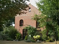 The chapel is a small and simple but "striking red and grey brick building".[9][10] The street-facing façade has two round-arched windows and a gabled entrance porch inscribed with the year 1834. Above this is a pediment, flush with the façade, whose tympanum has an oculus-style recess.[9][12] A distinctive feature of the pediment is its use of alternate grey and red bricks laid in Flemish bond pattern; the stretcher bricks (those with the long face showing) are red and the header bricks (whose short side is showing) are red, producing a regular pattern. The other walls are solely of red brick.[13]