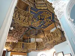 In the western porch there are massive two-tiered choir overhanging the church entrance. It is covered entirely with exquisite gilded carvings. The lower tier is designed in the form of a gallery, the upper one – in the form of a balcony resting on the columns of this gallery.[59] A stone staircase leads to the choir in the northwest pylon with the relief of Simeon the God-receiver. To communicate the lower tier of the choir with the upper one, a spiral staircase is arranged, located at the western end of the choir and enclosed in a solid pipe. The decoration of the choir is varied and elegant, as is the decoration of the iconostasis, but the carving is not so common here, because of which the dark blue background appears as large spots among golden patterns.[60]