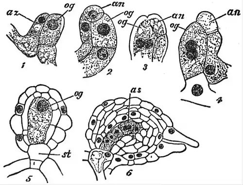1, Peronospora parasitica. Young multinucleate oogonium (og) and antheridium (an). 2, Albugo candida. Oogonium with the central uninucleate oosphere and the fertilizing tube (a) of the antheridium which introduces the male nucleus. 3, The same. Fertilized egg-cell (o) surrounded by the periplasm (p). |