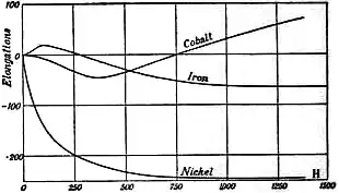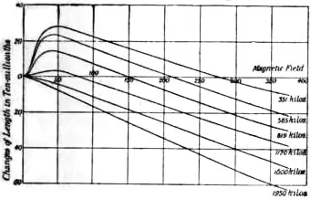 - ↑ Principal publications: J. P. Joule, Scientific Papers, pp. 46, 235; A. M. Meyer, Phil. Mag., 1873, 46, 177; W. F. Barrett, Nature, 1882, 26, 585; S. Bidwell, Phil. Trans., 1888, 179A, 205; Proc. Roy. Soc., 1886, 40, 109 and 257; 1888, 43, 406; 1890, 47, 469; 1892, 51, 495; 1894, 55, 228; 1894, 56, 94; 1904, 74, 60; Nature, 1899, 60, 222; M. Cantone, Mem. d. Acc d. Lincei, 1889, 6, 487; Rend. d. Acc. d. Lincei, 1890, 6, 252; A. Berget, C.R., 1892, 115, 722; S. J. Lochner, Phil. Mag., 1893, 36, 498; H. Nagaoka, Phil. Mag., 1894, 37, 131; Wied. Ann., 1894, 53, 487; C. G. Knott, Proc. Roy. Soc. Ed., 1891, 18, 315; Phil. Mag., 1894, 37, 141; Trans. Roy. Soc. Ed., 1896, 38, 527; 1898, 39, 457; C. G. Knott and A. Shand, Proc. Roy. Soc. Ed., 1892, 19, 85 and 249; 1894, 20, 295; L. T. More, Phil. Mag., 1895, 40, 345; G. Klingenberg, Rostock Univ. Thesis, Berlin, 1897; E. T. Jones, Phil. Trans., 1897, 189A, 189; B. B. Brackett, Phys. Rev., 1897, 5, 257; H. Nagaoka and K. Honda, Phil. Mag., 1898, 46, 261; 1900, 49, 329; Journ. Coll. Sci. Tokyo, 1900, 13, 57; 1903, 19, art. 11; J. S. Stevens, Phys. Rev., 1898, 7, 19; E. Rhoads, Phys. Rev., 1898, 7, 5; Phil. Mag., 1901, 2, 463; G. A. Shakespear, Phil. Mag., 1899, 17, 539; K. Honda, Journ. Coll. Sci. Tokyo, 1900, 13, 77; L. W. Austin, Phys. Rev., 1900, 10, 180; Deutsch. Phys. Gesell. Verh., 1904, 6, 4, 211; K. Honda and S. Shimizu, Phil. Mag., 1902, 4, 338; 1905, 10, 548.