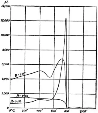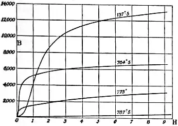 - ↑ A. M. Thiessen (Phys., 1899, 8, 65) and G. Claude (C. R., 1899, 129, 409) found that for considerable inductions (B = 15,000) the permeability and hysteresis-loss remained nearly constant down to −186°; for weak inductions both notably diminished with temperature.