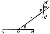 Similar magnetic poles are not merely indifferent to each other, but exhibit actual repulsion. This can be more easily shown if the compass is replaced by a magnetized knitting needle, supported horizontally by a thread. The north pole of the bar-magnet will repel the north pole of the suspended needle, and there will likewise be repulsion between the two south poles. Such experiments as these demonstrate the fundamental law that like poles repel each other; unlike poles attract. It follows that between two neighbouring magnets, the poles of which are regarded as centres of force, there must always be four forces in action. Denoting the two pairs of magnetic poles by N, S and N′, S′, there is attraction between N and S′, and between S and N′; repulsion between N and N′, and between S and S′. Hence it is not very easy to determine experimentally the law of magnetic force between poles. The difficulty was overcome by C. A. Coulomb, who by using very long and thin magnets, so arranged that the action of their distant poles was negligible, succeeded in establishing the law, which has since been confirmed by more accurate methods, that the force of attraction or repulsion exerted between two magnetic poles varies inversely as the square of the distance between them. Since the poles of different magnets differ in strength, it is important to agree upon a definite unit or standard of reference in terms of which the strength of a pole may be numerically specified. According to the recognized convention, the unit pole is that which acts upon an equal pole at unit distance with unit force: a north pole is reckoned as positive (+) and a south pole as negative (−). Other conditions remaining unchanged, the force between two poles is proportional to the product of their strengths; it is repulsive or attractive according as the signs of the poles are like or unlike.
