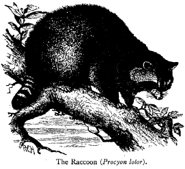 RACCOON (or RACOON), a name borne by the typical representative of a group of American arboreal placental mammals belonging to the order CARNIVORA (q.v.) and the family Procyonidae. The word is a corruption of the North-American Indian "arrathkune" or "arathcone." The Fr. raton or raton laveur, Ger. Waschbär, and other European names are derived from a curious habit the raccoon has of dipping or washing its food in water before eating it. The typical raccoon (Procyon lotor) is a thickly built animal about the size of a badger, with a coat of long coarse greyish-brown hairs, short ears, and a bushy black-and-white-ringed tail. Its range extends over the whole of the United States, and stretches on the west northwards to Alaska and southwards well into Central America, where it attains its maximum size. The following notes on the habits of the raccoon are from Dr C. Hart Merriam's The Mammals of the Adirondacks:—