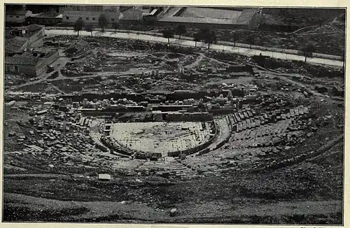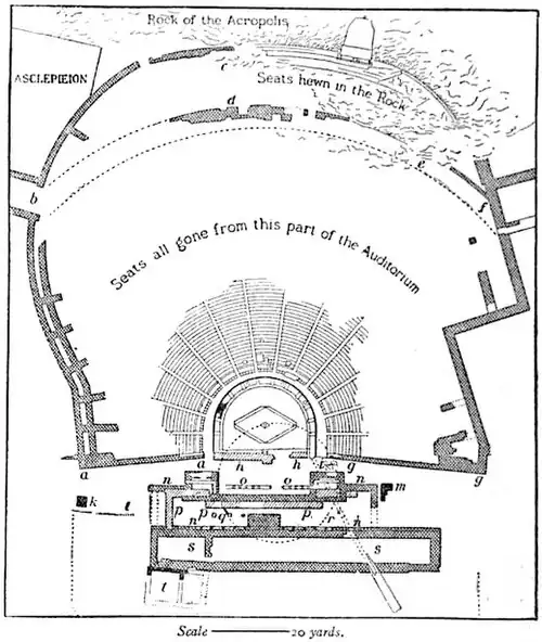- ↑ This theatre was not begun when Pausanias wrote his book Attica, and was complete when he wrote the Achaica (see Paus. vii. 20). It is illustrated in Mon. Inst. vi., plate 16.