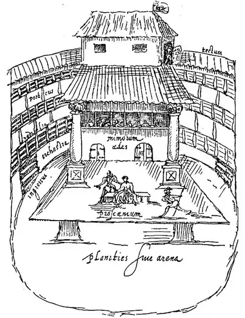 The plan of the first English theatres appears to have had no connexion with those of classical times, as was the case in Italy: it was evidently produced in an almost accidental way by the early custom of erecting a temporary platform or stage in the middle of the open courtyard of an inn, in which the galleries all round the court formed boxes for the chief spectators, while the poorer part of the audience stood in the court on all sides of the central stage. Something similar to this arrangement, unsuitable though it now seems, was reproduced even in buildings, such as the Globe, the Fortune and the Swan, which were specially designed for the drama. In these and other early theatres there was a central platform for the stage, surrounded by seats except on one side, where there was a "green-room" or "tireynge-howse." The upper galleries or boxes completely surrounded the stage, even the space over the green-room being occupied by boxes. This being the arrangement, it is easy to see why the octagonal plan was selected in most cases, though not in all—the Fortune theatre, for example, was square. An interesting specification and contract for the building of the Fortune theatre (see below) is printed by Halliwell-Phillipps (op. cit. infra, p. 164). In all its details the Fortune is specified to be like the Globe, except that it is to be square in plan, and with timbers of heavier scantling. The walls are to be of wood and plaster, the roof tiled, with lead gutters, the stage of oak, with a "shadow" or cover over it, and the "tireynge-howse" to have glazed windows. Two sorts of boxes are mentioned, viz., "gentlemen's roomes" and "twoo-pennie roomes." A woodcut showing this arrangement of the interior is given in a collection of plays edited by Kirkman in 1672. The vexed question of the construction of these theatres has been much discussed in recent years. In 1888 a drawing of the Swan theatre (fig. 4), apparently copied from a rough drawing in a London letter from the traveller Johannes de Witt, was discovered by Dr Karl Gaedertz in a manuscript volume in the Utrecht University library, consisting of the commonplace book of Arend van Buchell (1565–1641). While undoubtedly authentic, and probably broadly accurate, this copied sketch cannot be accepted, however, as giving the regular or typical plan of the contemporary theatre, as in some respects it does not fulfil the known conditions of the stage. What that typical plan was, if (as is probable) one actually existed, has led to much learned conjecture and great difference of opinion as regards the details required by the interpretation of contemporary stage directions on the necessities of the action in contemporary drama. The ingenious reconstruction (fig. 5), drawn by W. H. Godfrey in 1907, of the Fortune theatre, following the builder's specification, appears to approach very nearly to satisfying all the requirements. (See "The Elizabethan Stage," in the Quarterly Review (London), April 1908.)