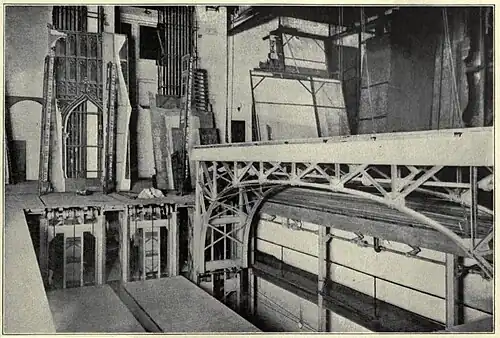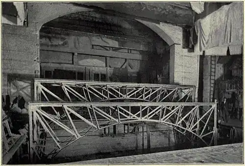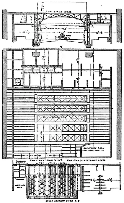 The stage may be described as consisting of a series of six horizontal sections running parallel with the curtain line from front to back, each section being 8 ft. wide, and the whole being followed by a large back or rear stage. The first section contains nothing but a plain "carpet cut," and openings to take the old-fashioned "grave" trap, "star" trap, or other similar contrivances. The second and third sections comprise large bridges, which can be raised 6 ft. above the stage or lowered 8 ft. below the stage, constructed in two levels, on the lower level of which appliances can be installed for the purpose of raising minor platforms above stage level or sinking traps and the like. The fourth, fifth and sixth sections comprise large bridges running right across the stage front, which can be raised 9 ft. above the stage or lowered 8 ft. below it. The back stage has no openings or mechanism beyond certain trap-doors to a scenery store, and the necessary electrical mechanism for raising and lowering scenery for storage purposes. Between the various sections of the stage, long longitudinal flaps, 2 ft. wide, have been formed, which can, be easily opened to allow scenery to be passed through below for transformation scenes and the like. Each section is equipped with what is termed a pair of chariots, to hold "wing" lights placed on so-called wing ladders. All the electrical bridges are worked from the "mezzanine" level and from ordinary switchboards, and can be raised and lowered at various speeds, and take loads up to 2 tons. They can be moved without vibration or noise at a cost of about ¼d. for power on a full rise when loaded.