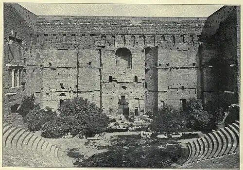 - ↑ Vitruvius prescribes for the Roman theatre a portico running round the interior of the auditorium on the level of the topmost row of seats; remains of such a portico (or, as at Aspendus, of a series of arcades) can sometimes be traced.