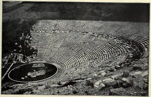 THEATRE (θέατρον, "a place for seeing," from θεᾶσθαι), a building specially devised for dramatic representations. The drama arose from the choric dances in honour of Dionysus, which were held in a circular dancing-place (ὀρχήστρα, Lat. orchestra) in his precinct at the foot of the Acropolis at Athens. When the leader of the chorus held a dialogue with the remaining choreutae he mounted the table which stood beside the altar of Dionysus in the centre of the orchestra; but as the number of actors and the importance of the dialogue increased, it became necessary to erect a platform at the side of the dancing-place and a booth in which the performers could change their dresses and masks. At the same time temporary wooden stands (ἴκρια) were set up for the spectators, who no longer ranged themselves around the whole ring, but only on the slope of the Acropolis, facing southward. We are told that the collapse of the ἴκρια, in 499 B.C. led to the erection of a permanent theatre; this was not, however, a stone building. Embankments were made for the support of the spectators' benches: the stage buildings were of wood, and, although some traces of a stone theatre belonging to the end of the 5th century have been pointed out, the "theatre of Dionysus," whose remains may still be seen (Pl. I. and II.), is in the main a work of the 4th century. It was completed soon after 340 B.C. under the administration of the statesman and financier Lycurgus. Alterations were made in the stage-buildings in the Hellenistic period, under Nero, and again in the 3rd century A.D. Although the prototype of Greek theatres, it is not the most perfectly preserved. Amongst those of purely Greek design the most typical is that of Epidaurus (Pl. I.), which was built in the latter part of the 4th century B.C. by Polyclitus the Younger. The largest known to Pausanias was that of Megalopolis, excavated by the British School at Athens in 1889–91, in which the stage buildings were replaced by the Thersilion, a large council-chamber. Others of importance for the study of the ancient theatre have been excavated at Delos, Eretria, Sicyon and Oropus. None of these, of course, is contemporary with the classical period of the Greek drama, and their stone stage-fronts belong to the Hellenistic period.