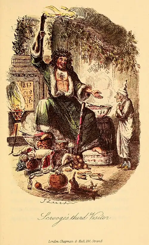 It was his own room. There was no doubt about that. But it had undergone a surprising transformation. The walls and ceiling were so hung with living green, that it looked a perfect grove, from every part of which, bright gleaming berries glistened. The crisp leaves of holly, mistletoe, and ivy reflected back the light, as if so many little mirrors had been scattered there; and such a mighty blaze went roaring up the chimney, as that dull petrifaction of a hearth had never known in Scrooge's time, or Marley's, or for many and many a winter season gone. Heaped up upon the floor, to form a kind of throne, were turkeys, geese, game, poultry, brawn, great joints of meat, sucking-pigs, long wreaths of sausages, mince-pies, plum-puddings, barrels of oysters, red-hot chesnuts, cherry-cheeked apples, juicy oranges, luscious pears, immense twelfth-cakes, and seething bowls of punch, that made the chamber dim with their delicious steam. In easy state upon this couch, there sat a jolly Giant, glorious to see; who bore a glowing torch, in shape not unlike Plenty's horn, and held it up, high up, to shed its light on Scrooge, as he came peeping round the door.