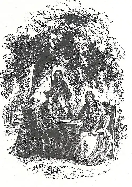 According to the right rule of historical fiction, the characters are unhistorical. "The domestic life of a few simple private people is so knitted and interwoven with the outbreak of a terrible public event, that the one seems but part of the other." Dickens does not give us long chapters of actual history. He could have introduced the real people—the King, Danton, Robespierre, St. Just; and Dumas or Scott would probably have done so, with good effect. But the more modest plan is the safer, and, as the example proves, not the less interesting. The Revolution exists, so to say, for the story. Even that gallant feat, the storming of a scarcely defended castle, is described because of its necessity to the plot; the Doctor's manuscript, concealed in No. 105, North Tower, has to be discovered by Defarge. The novel does rather suggest that the Bastille was assaulted mainly for that purpose, and that the Revolution was chiefly caused by the vintner's wife, "to serve her private ends." The conditions, or some of them, which nourished the bacillus of revolt, are described, however, in earlier chapters, consistently with what Dickens calls "the philosophy of Mr. Carlyle's wonderful book." With similar skill the September massacres are not dragged in, for the mere sake of description, but are of moment to the conduct of the story. It were hypercritical to object to the coincidence whereby the spies, whom we first met in England, meet and are mastered by Carton at the nick of time. Such allowances are the common right of novelists. Indeed, when Dickens, writing to Monsieur Regnier of the Comédie Française, called this book "the best story I have written," his self-criticism was just. It is the best charpenté of his tales up to that date; the most compact, and the most lucid in its development. Excellence in construction had not hitherto been his forte, partly because his tales had too many interests, in which that of plot was apt to be obscured and overlaid by a mass of heterogeneous detail. In this instance, just because the characters were to be "pounded out" by circumstance, all lies clear before the eye of author and reader.