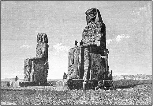 begun their great works of canalisation. Doubtless most of the monuments erected near the river, such as the slabs of stone paving the great avenue of sphinxes at Kurnuk, the colossal statues of Memnon, and even a block bearing a comparatively recent Greek inscription, are now found buried to some depth below the surface. But this is due not so much to change of level as to subsidence, such huge masses naturally sinking gradually in the alluvial soil of the riverain plains. In the same way the erratic boulders in Switzerland and the colonnades of the Roman temples have sunk more and more below the surrounding surface. The Nilometer discovered by Girard in Elephantine Island is perhaps one of those monuments whose foundations have thus given way. Hence although the present high-water mark may exceed the old measurement by 8 or 9 feet, it does not follow that the bed of the river and its banks have been raised to that extent. Such a phenomenon could not be reconciled with the drying up of the old bed east of Asuan, which has now been abandoned by the stream.