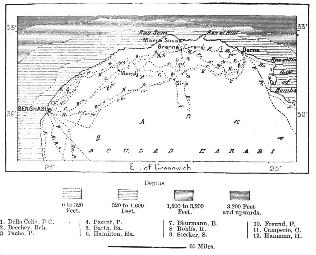 Then came the brothers Beechey, who occupied themselves chiefly with the maritime districts, and the artist Pacho, whose attention was directed mainly to the ruined cities of the plateaux. Cyrenaica was also traversed by Delaporte, De Bourville, Barth, Hamilton, De Beurmann, Gerhard Rohlfs, Murdoch Smith, and Porcher, and of late years it has been successively visited by a great many travellers,