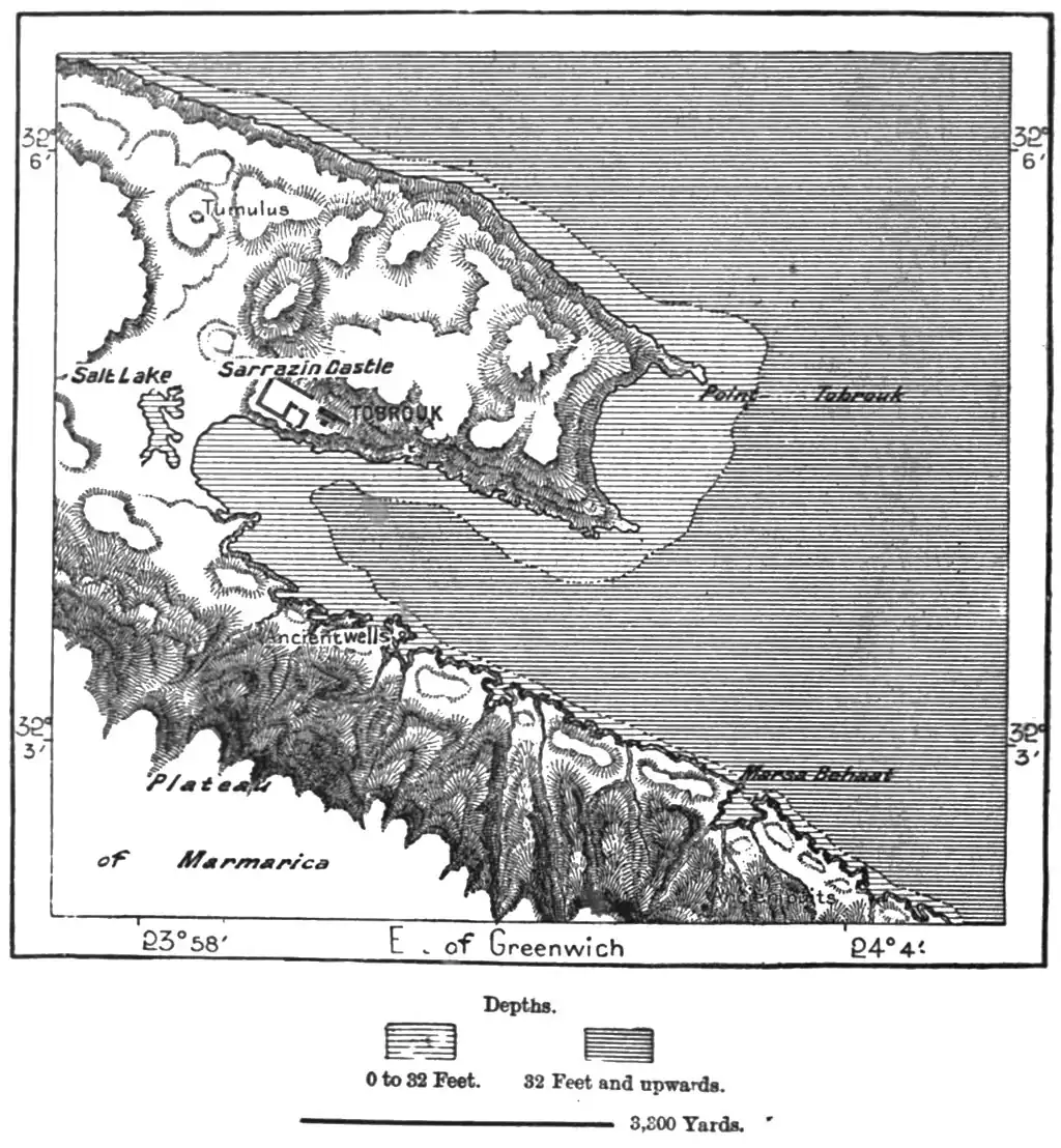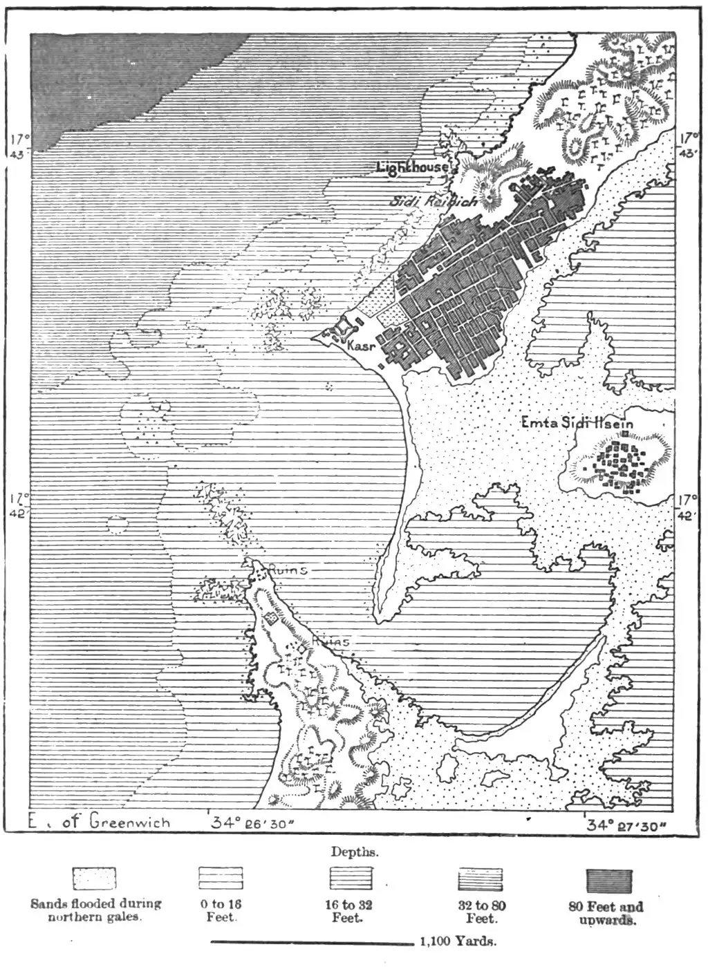 Benghazi, capital of the province of Barka and of all eastern Tripolitana, occupies the whole site of the ancient Hesperides, except a portion of the headland crowned by the castle, which was washed away by the waves, the débris contributing to fill up the old port. The town lies at the southern extremity of the rocky promontory enclosed south and west by the sea. Eastwards stretches a salt lake which, even during the historic period, still formed part of the Mediterranean, and which, in stormy weather, is even now occasionally encroached upon by the waves. In summer it presents nothing but a muddy bed covered with saline efflorescences. The isthmus between lake and sea is commanded by an eminence supposed to be the island mentioned by the ancient writers as standing in the middle of the harbour and crowned by a temple of Venus, now replaced by the tomb of a Marabut. Other lakes or morasses stretch north and south, separated from the Mediterranean by a narrow strip of coastline. Yet Benghazi is less insalubrious than most other