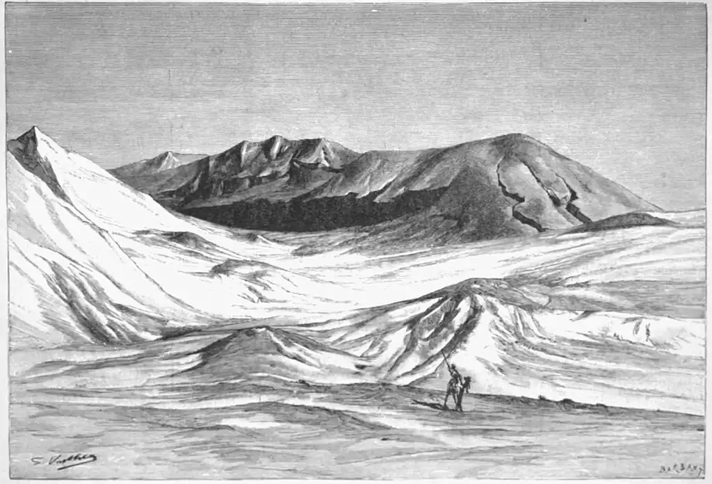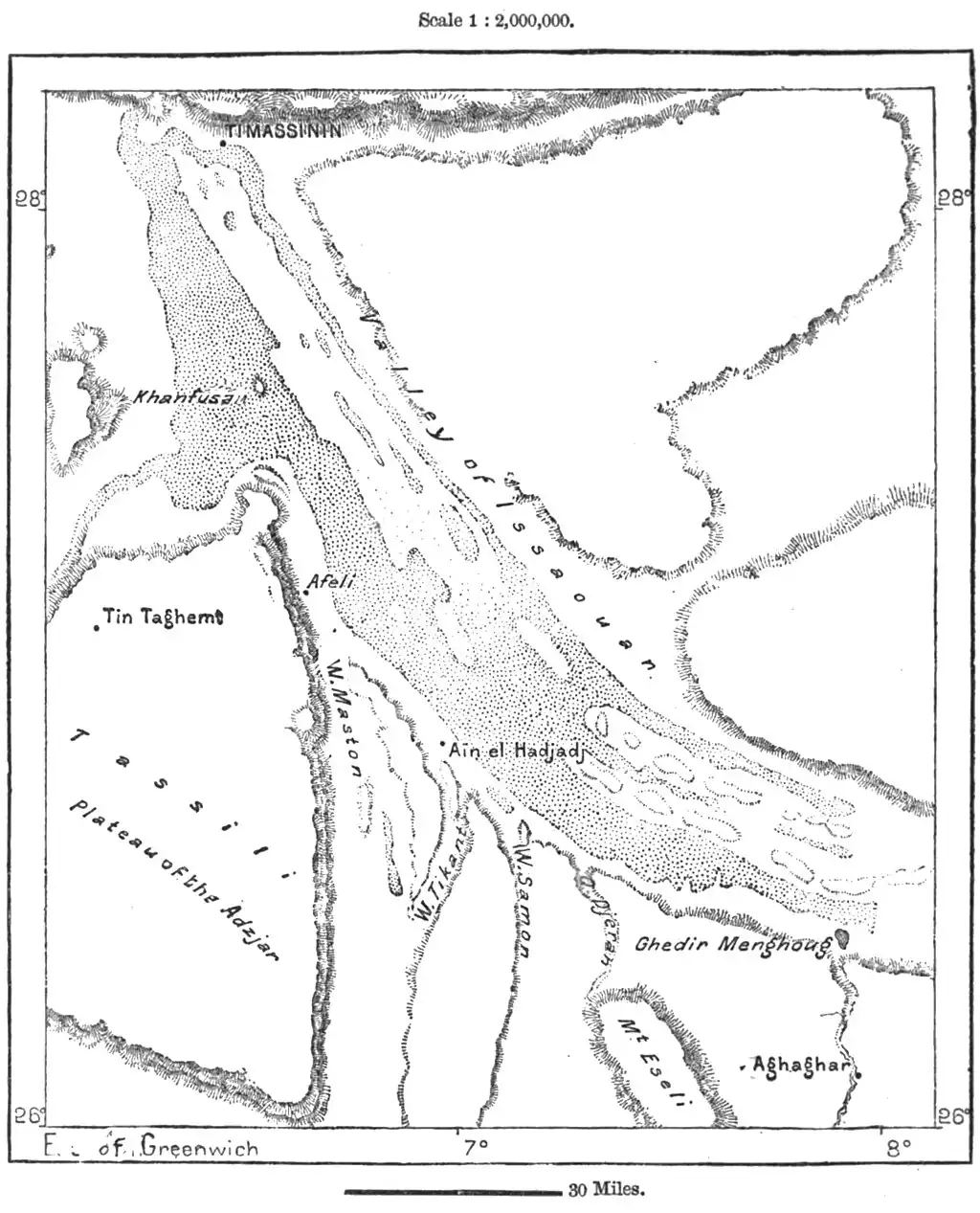 Towards the centre of this escarpment rises a group of heights, designated, like so many others in this region, by the name of Adrar, or "the Mountains," in a preeminent sense. According to Duveyrier, Mount In-Esokal, culminating point of the system, and rising to a height of over 5,000 feet, is certainly a volcanic crest,