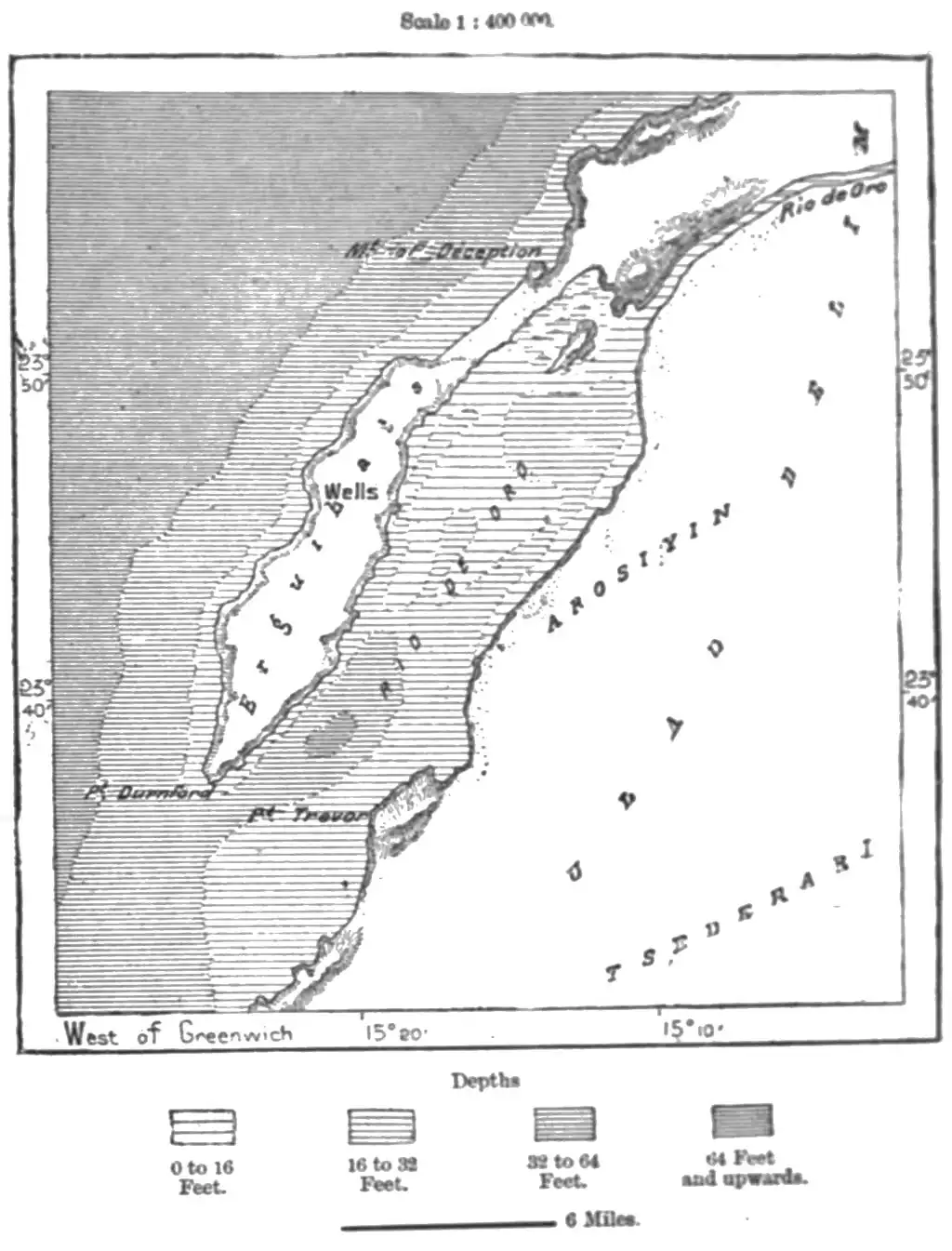 EST of the transverse depression which extends from the southern limits of the province of Oran southwards to the Niger, and which throughout its entire length is probably occupied by the dried-up bed of the Messaura, the Suhara nowhere presents any prominent mountain ranges constituting a distinct physical region. Throughout its whole extent this vast tract, comprising a superficial area of over 800,000 square miles, presents nothing but an everlasting succession of dunes, depressions, slightly elevated hamadas, rocky ridges or low ranges scarcely anywhere exceeding 1,600 feet above sea-level. To the whole of this western section of the Sahara, which nevertheless has a breadth of over 600 miles, the inhabitants of the Wed Saura basin apply the general designation of Sahel, or "coastland," as if it were a mere inland extension of Atlantic seaboard.