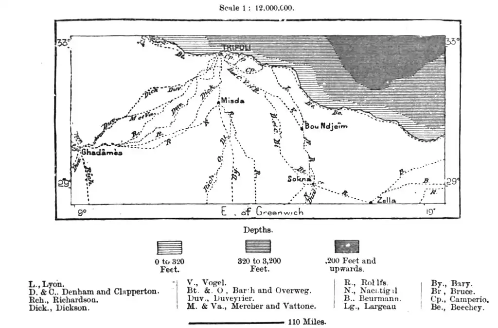 and Clopperton, Laing, Richardson, Barth, Vogel, Beurmann, Duveyrier, Mercher and Vattone, Rohlfs, Nachtigal, Von Bary and Krafft, these explorers, starting mostly from Tripoli, have neglected many interesting districts in the interior; while little has yet been done for the geology, meteorology, ethnology, and archæology of the land.