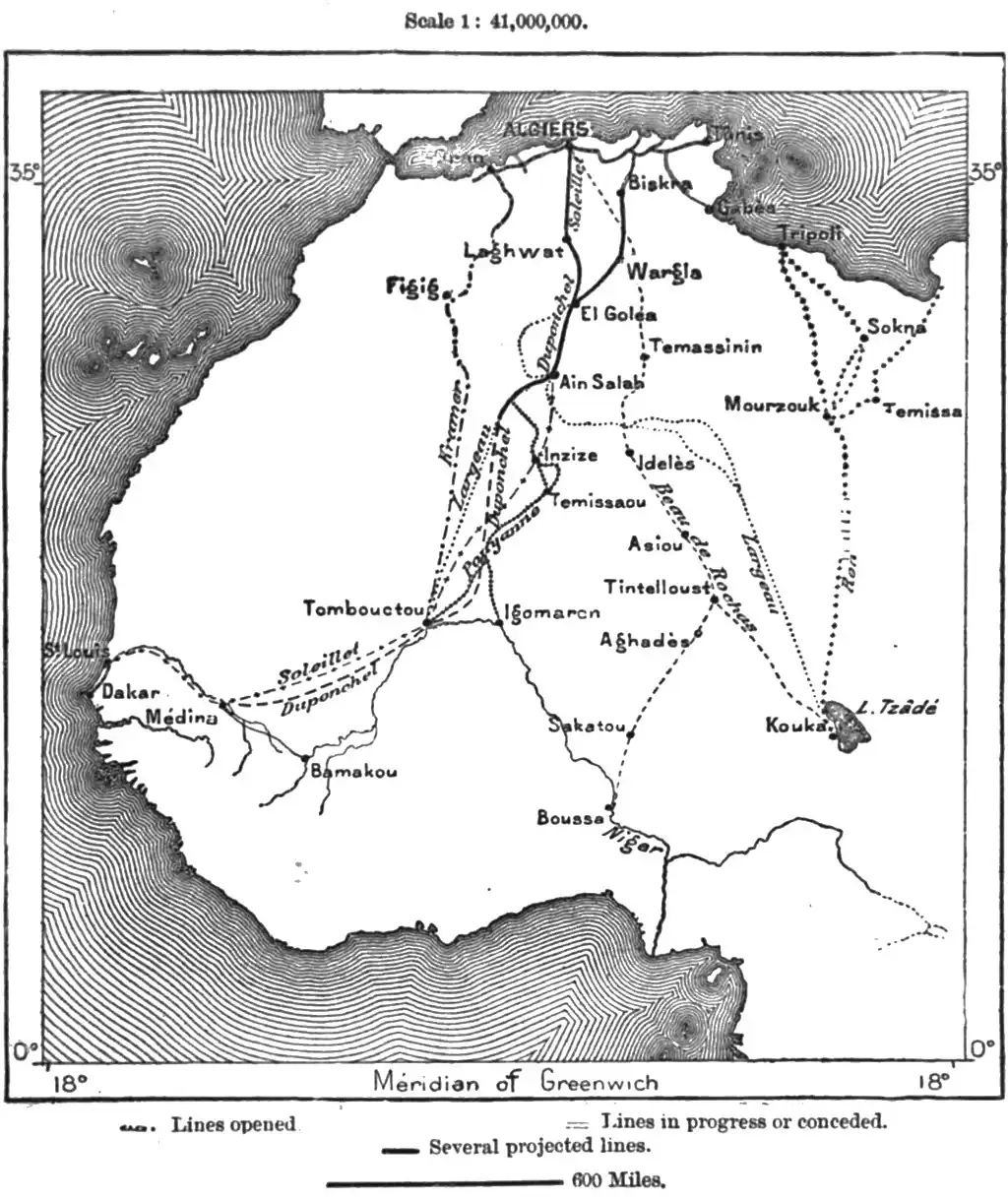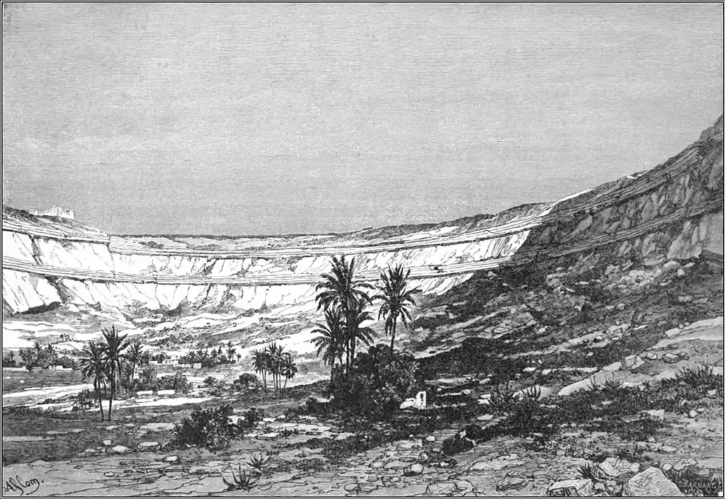 Herbage, brushwood, and living things are rare in this desolate waste, which is avoided by the very birds, that fear to wing their way across solitudes more formidable than the seas themselves. Nevertheless camels find here and there a little nourishment in the scanty vegetation offered by a few depressions along the track across the plateau. Barth even came upon some stunted palms in one of these hollows, where the water collected after the rare storms soon evaporates leaving nothing in its place except a thin saline efflorescence. In many places channels have been formed by the wadies, although the running waters have not been sufficiently copious to excavate a complete river bed in the rock, so that beyond the last basin of erosion the depression is again closed.