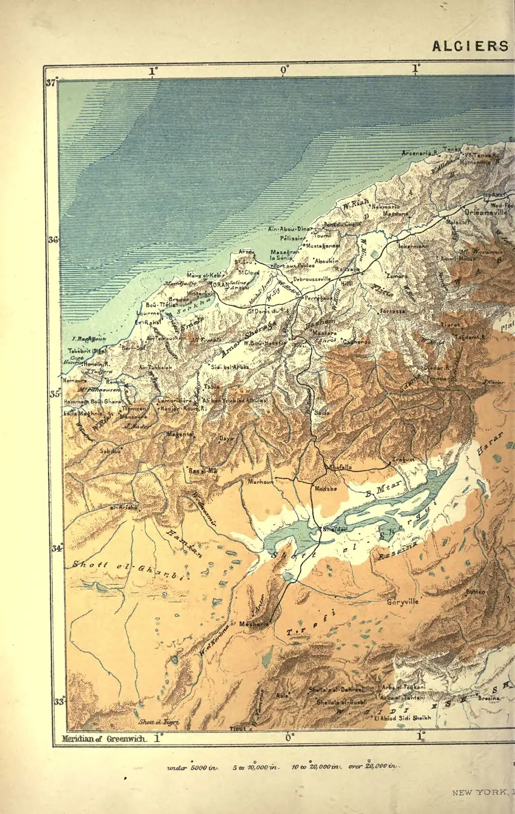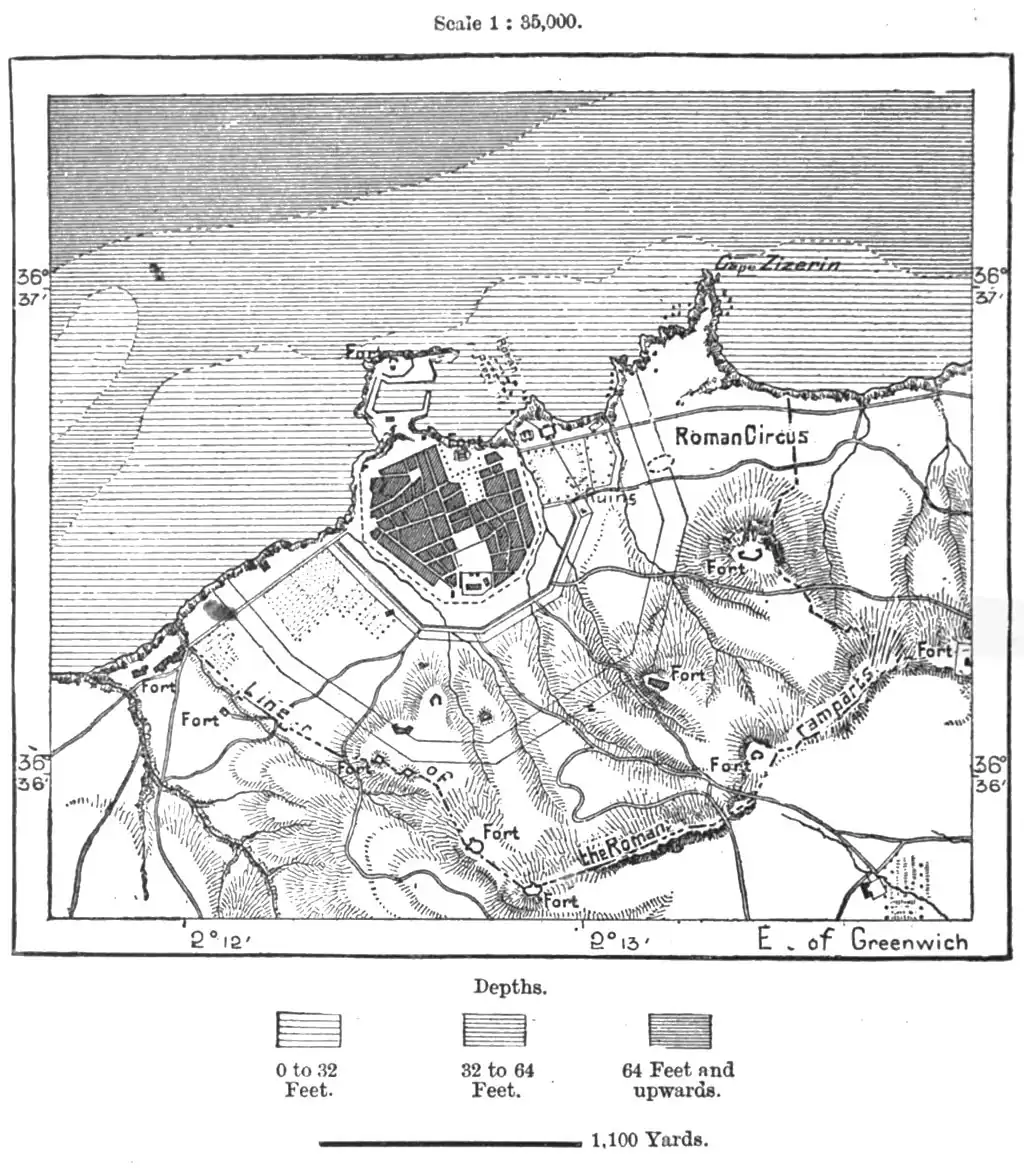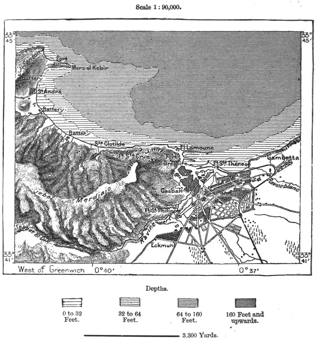 Oran, the Wahran or Guharan of the Arabs and Turks, is the first commercial mart in Algeria, and for a time rivalled Algiers itself in wealth and population. Founded at the beginning of the tenth century by the Andalusian Moors, it soon acquired importance, thanks to the neighbouring harbour of Mers-el-Kebir, or the "Great Port," sheltered by the Jebel Santon headland from the dangerous north and north-west winds. This harbour of refuge, the Portus Divinus of the Romans,