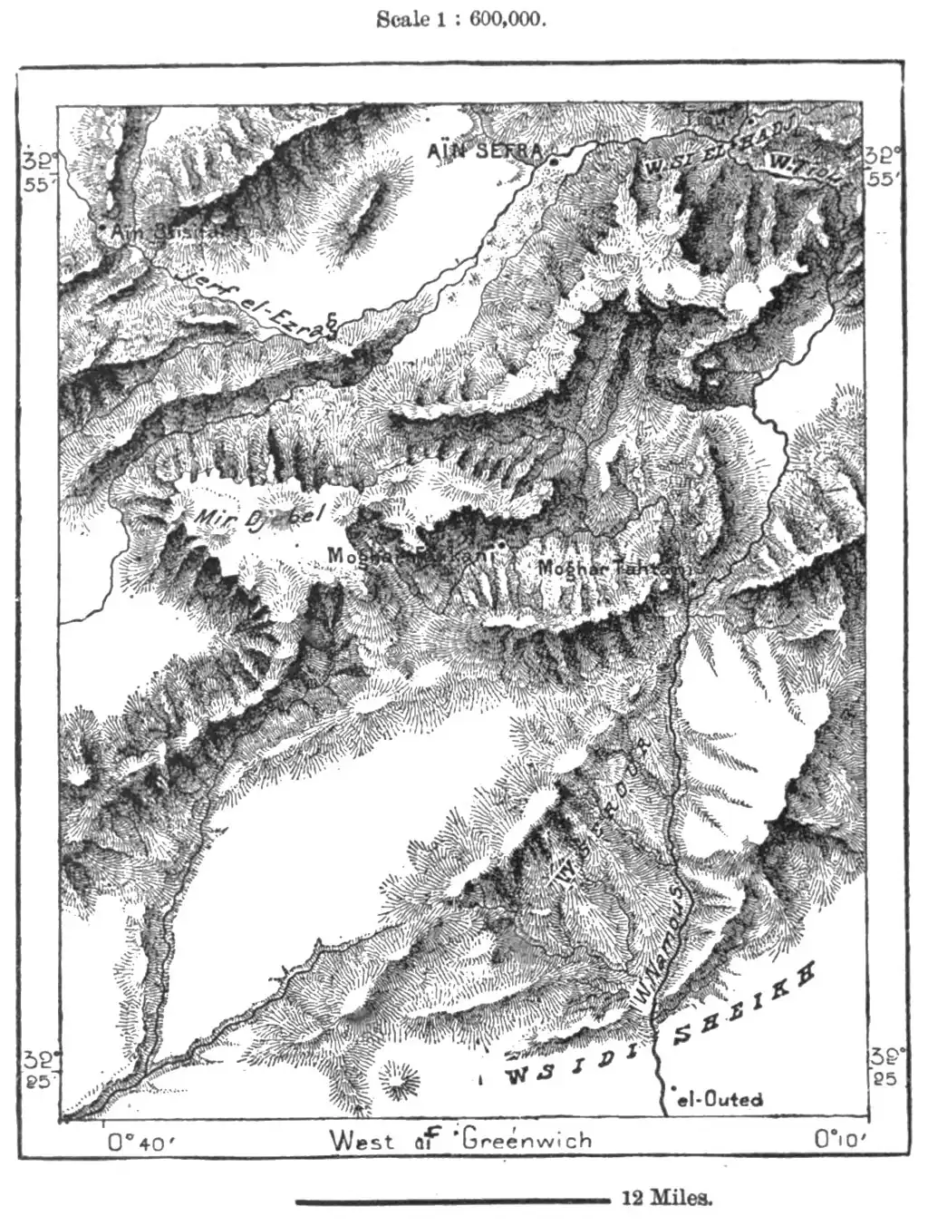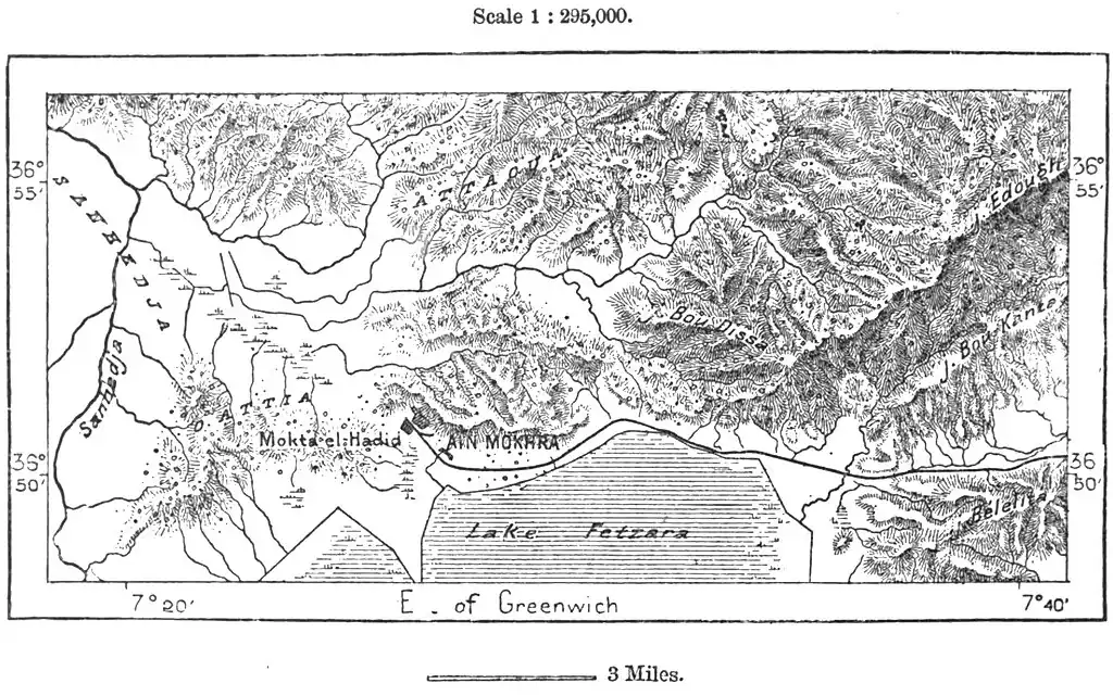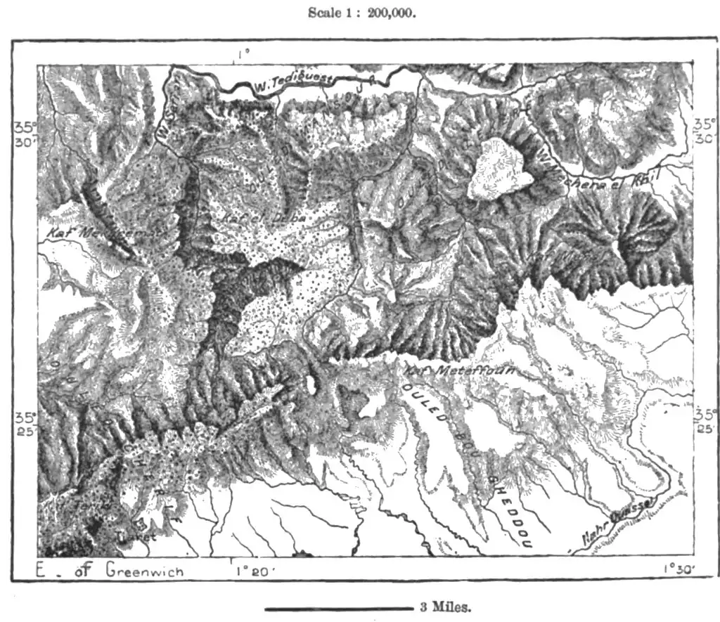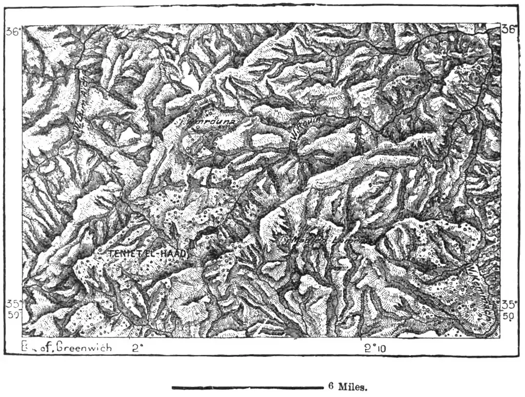 of regard for the prior claims of Marocco. The frontier in this direction is far from clearly marked, no natural line of demarcation having been followed in determining the political confines, which by the treaty of Tangier, in 1844, were laid down at haphazard across mountains, valleys, and tribal districts.