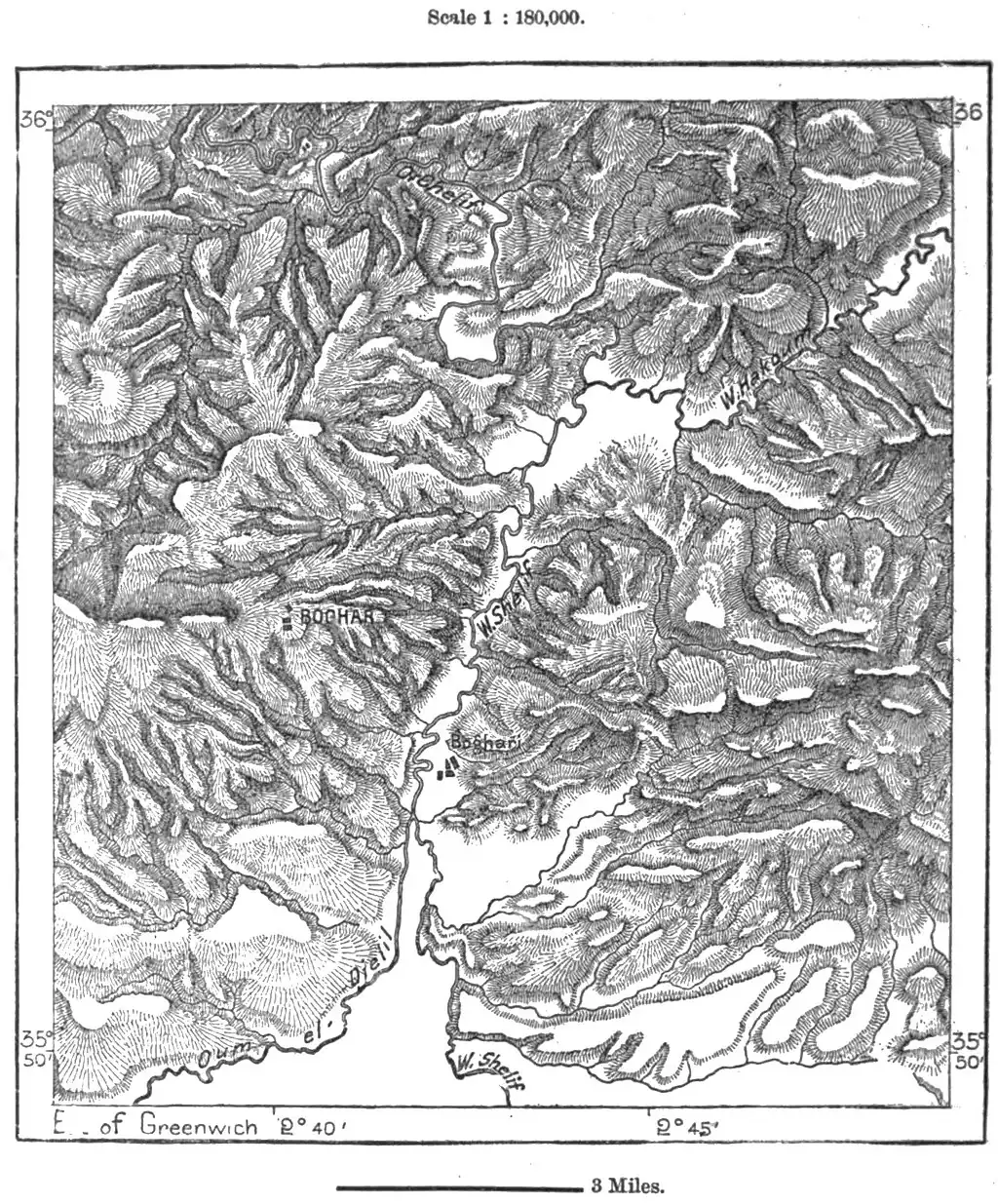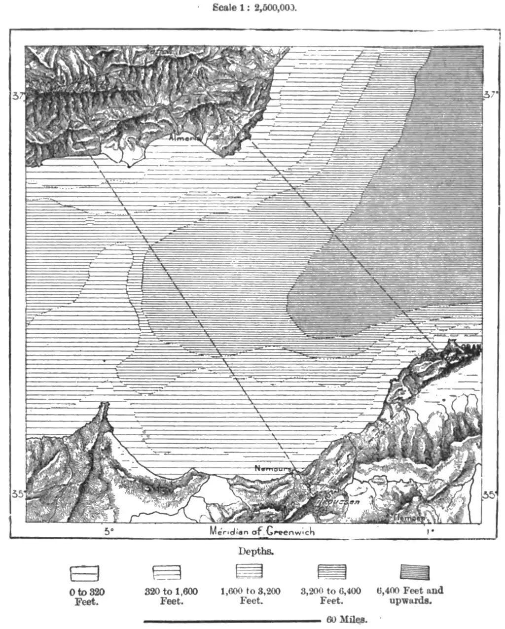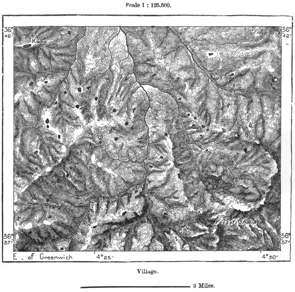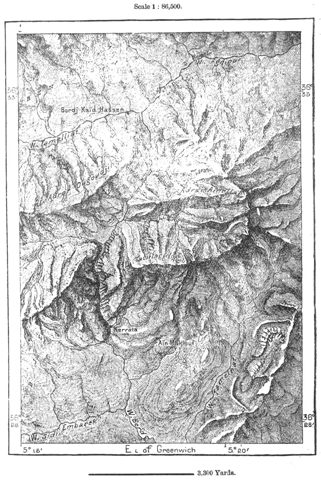 of regard for the prior claims of Marocco. The frontier in this direction is far from clearly marked, no natural line of demarcation having been followed in determining the political confines, which by the treaty of Tangier, in 1844, were laid down at haphazard across mountains, valleys, and tribal districts.