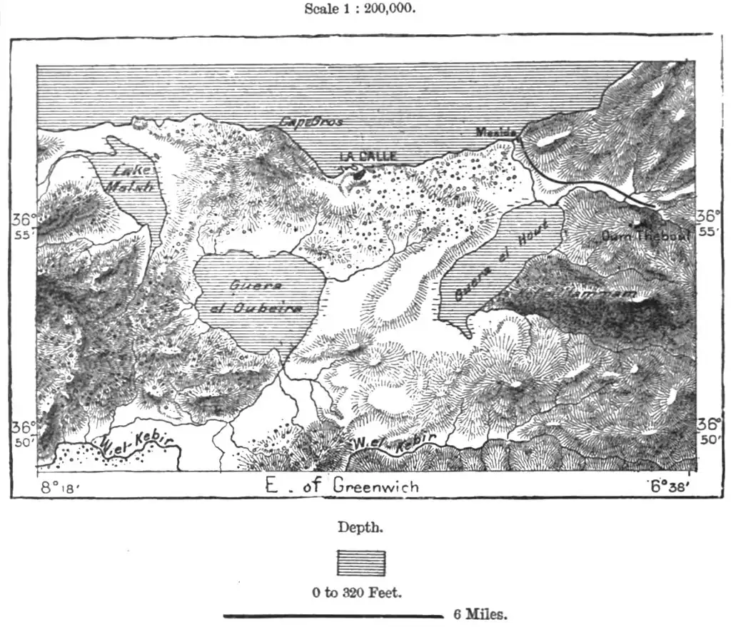 and ramifies eastwards in secondary sebkhas, which rise and fall according to the rainfall and greater or less evaporation. The Shott Melghigh, forming the northern division of the depression, terminates eastwards in the Shott Sellem, beyond which follow several others disposed north and south, and separated by a tongue of land from the Tunisian Shott Gharsa. This basin itself is separated only by Jerid from the vast sebkhas which stretch eastwards to the Isthmus of Cabes. At first sight it seemed natural enough to regard the whole of this lacustrine system as the remains of an ancient inlet, into which the mighty Igharghar discharged its waters, and this view was generally accepted before the true relief of the land had been determined by cureful surveys. It has now been made evident that neither in historic times, nor even in the present geological epoch, did the Igharghar reach the Tunisian shotts, which are separated from each other and from the sea by two rocky sills, showing no trace of ever having been subject to the action of water. The general slope of the land is aleo opposed to such a view, being inclined not seawards, but in the opposite direction, towards the inland lakes. The salts of the shotts are of diverse composition, differing from those of sea-water, and in certain places containing more sulphate of soda than