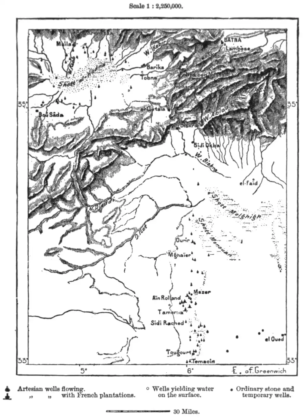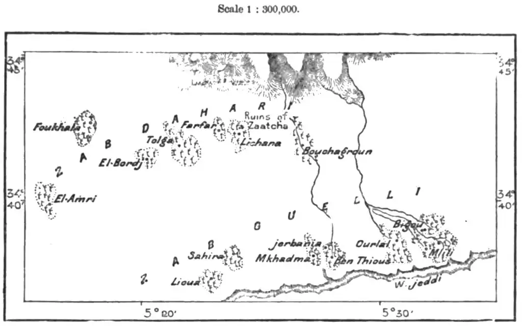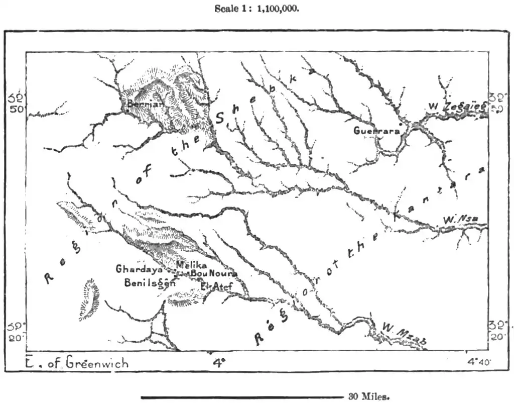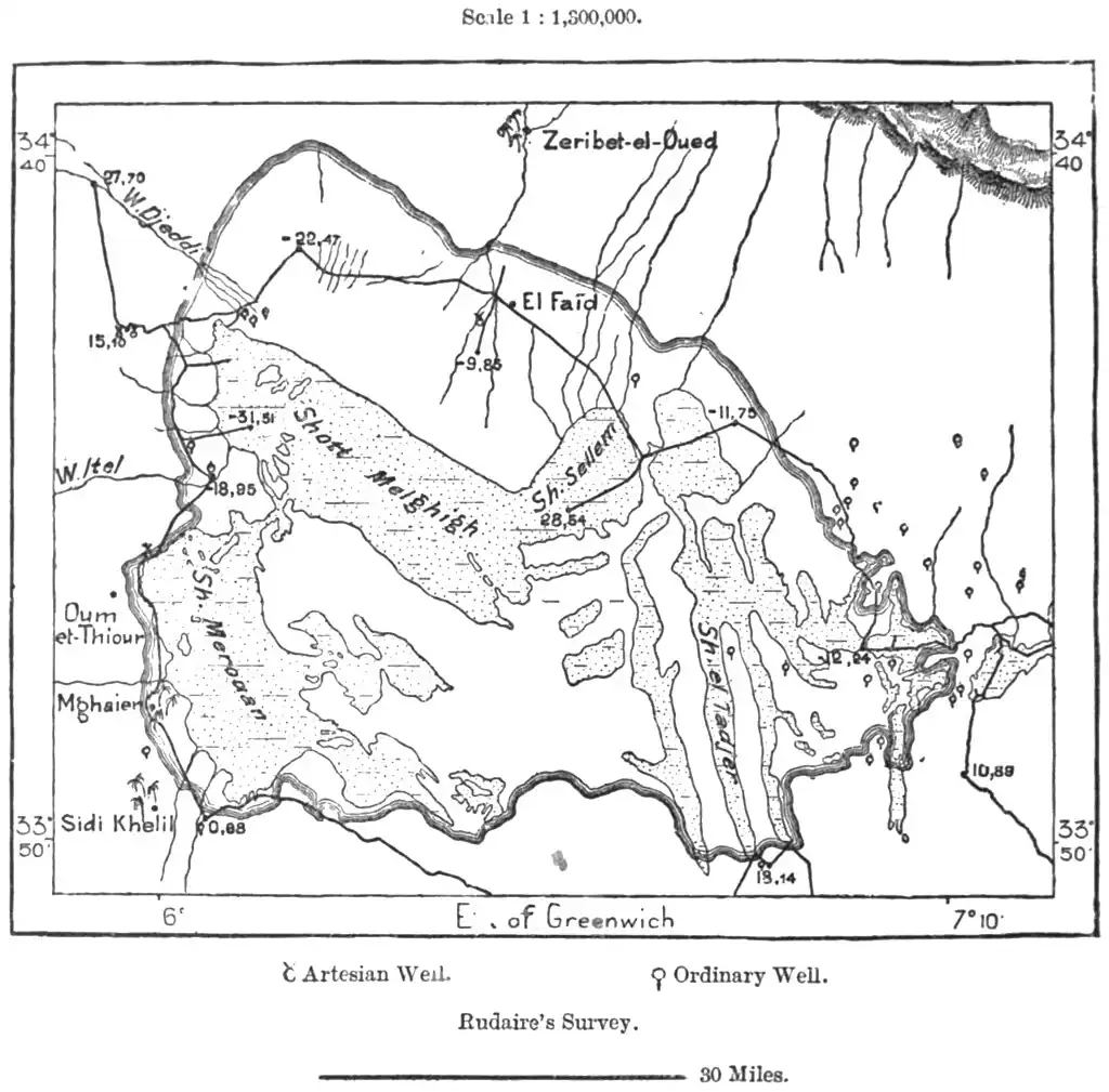 Like the oases of the Wed Righ, those of the Wed Jeddi belong also to the basin of the "inland sea," if this term can be any longer applied to the saline depression of the Shott Melghigh. More than half of Southern Algeria draining towards the Sahara, from the Jebel Amur to the Tunisian frontier, forms part of this basin, the central reservoir of which is at present almost dry.