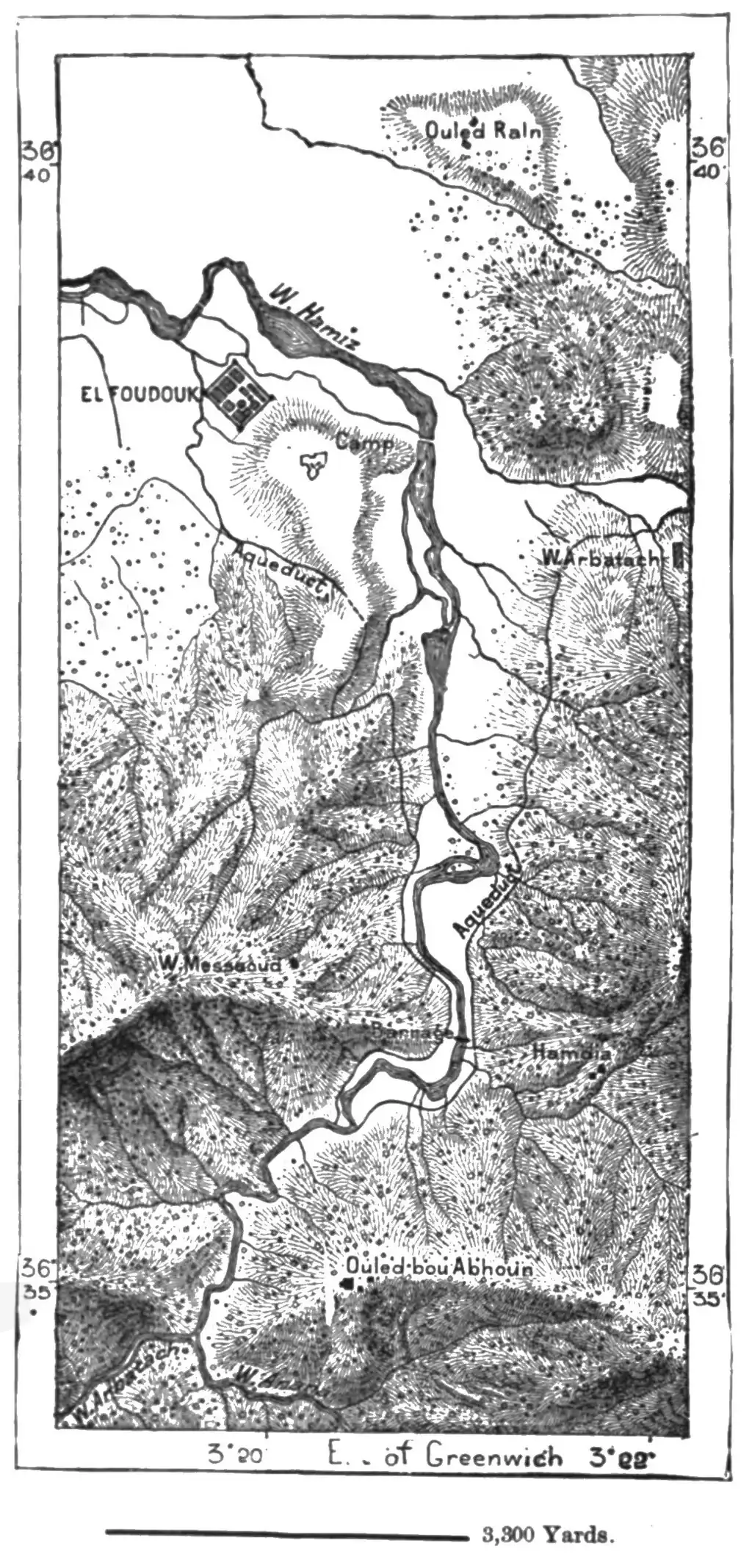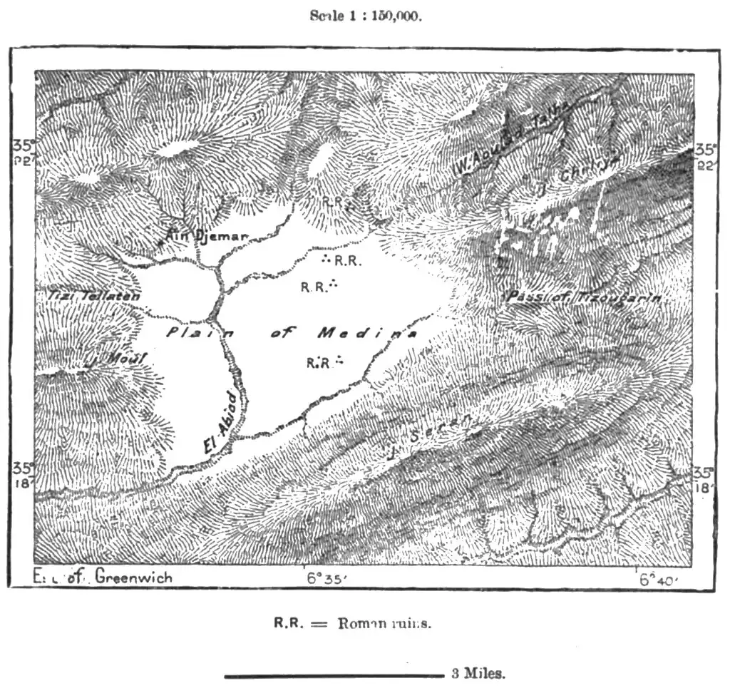 West of the Tizugarin pass stretches the extensive plain which seems destined to become the centre of European colonisation in the Aures, but whose rich pastures are meantime held in common by all the branches of the Ulud-Daud tribe. Here begins the valley of the Wed-el-Abiad, which has a south-westerly course, losing itself in the Sahara below the Tranimin gorges. The nearly parallel Wed Abdi Valley is held by the brave Ulad-Abdi tribe, whose stronghold