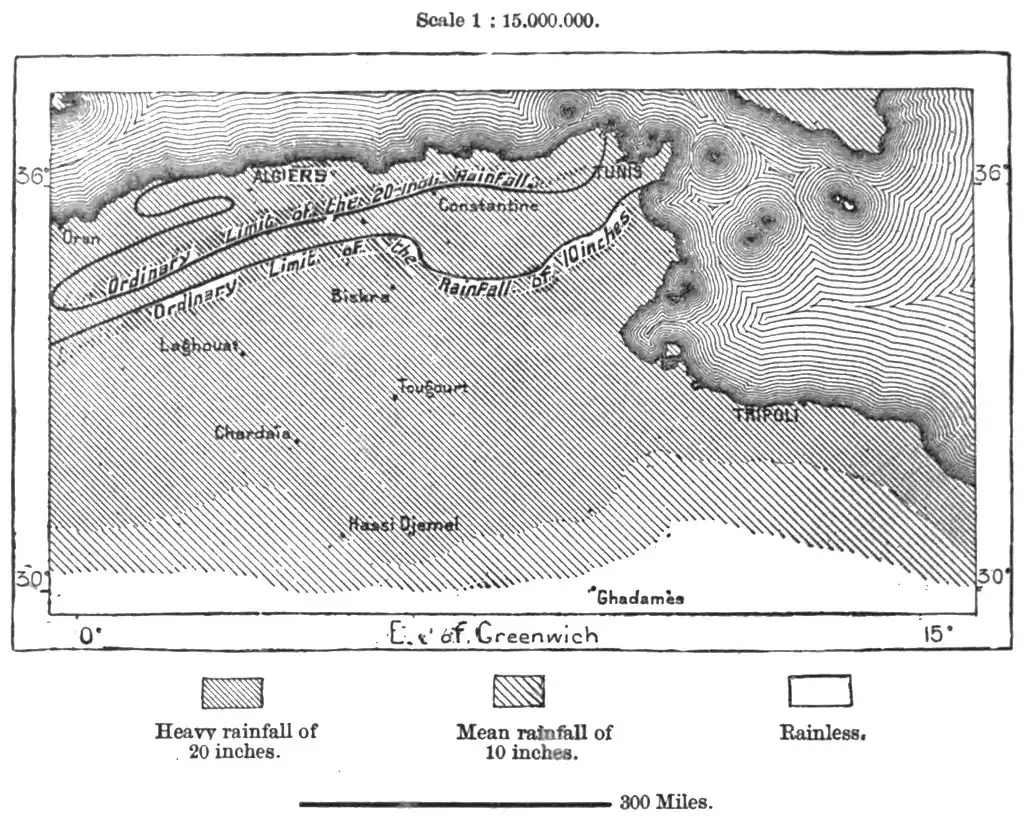 The usual division of the year into four seasons is scarcely applicable to Algeria, which has really not more than two well-defined periods — moist and temperate from September to the end of May, hot and dry for the remaining three months of the year. The position of Algeria on a coast completely exposed to the sea breezes gives to the anemometric régime a paramount influence in the distribution of heat, moisture, and atmospheric pressure. Here the winds have free play from all quarters, even from the interior, where the Sahel uplands retard their progress without perceptibly modifying their direction. The sirocco, or hot wind from the south, is tempered by the vicinity of the sea, while